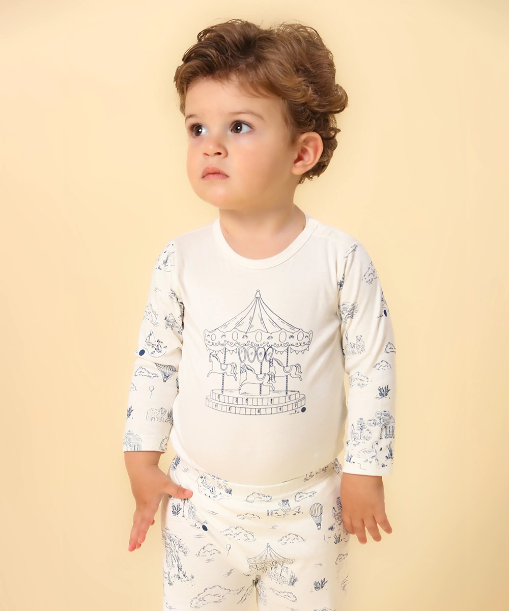 O conjunto de pijama Basics é essencial no enxoval dos bebês de todas as idades, com o diferencial que só a Cookie tem: o conforto extra do nosso super macio algodão pima peruano, e nossas estampinhas exclusivas desenvolvidas em Paris! Muito estilo para o seu baby sonhar! O body tem mangas longas, silk fofo, e abertura de botões na lateral do body e entre as perninhas. Calça longa com elástico na cintura. Mais que um pijama, um carinho para o seu pequeno!