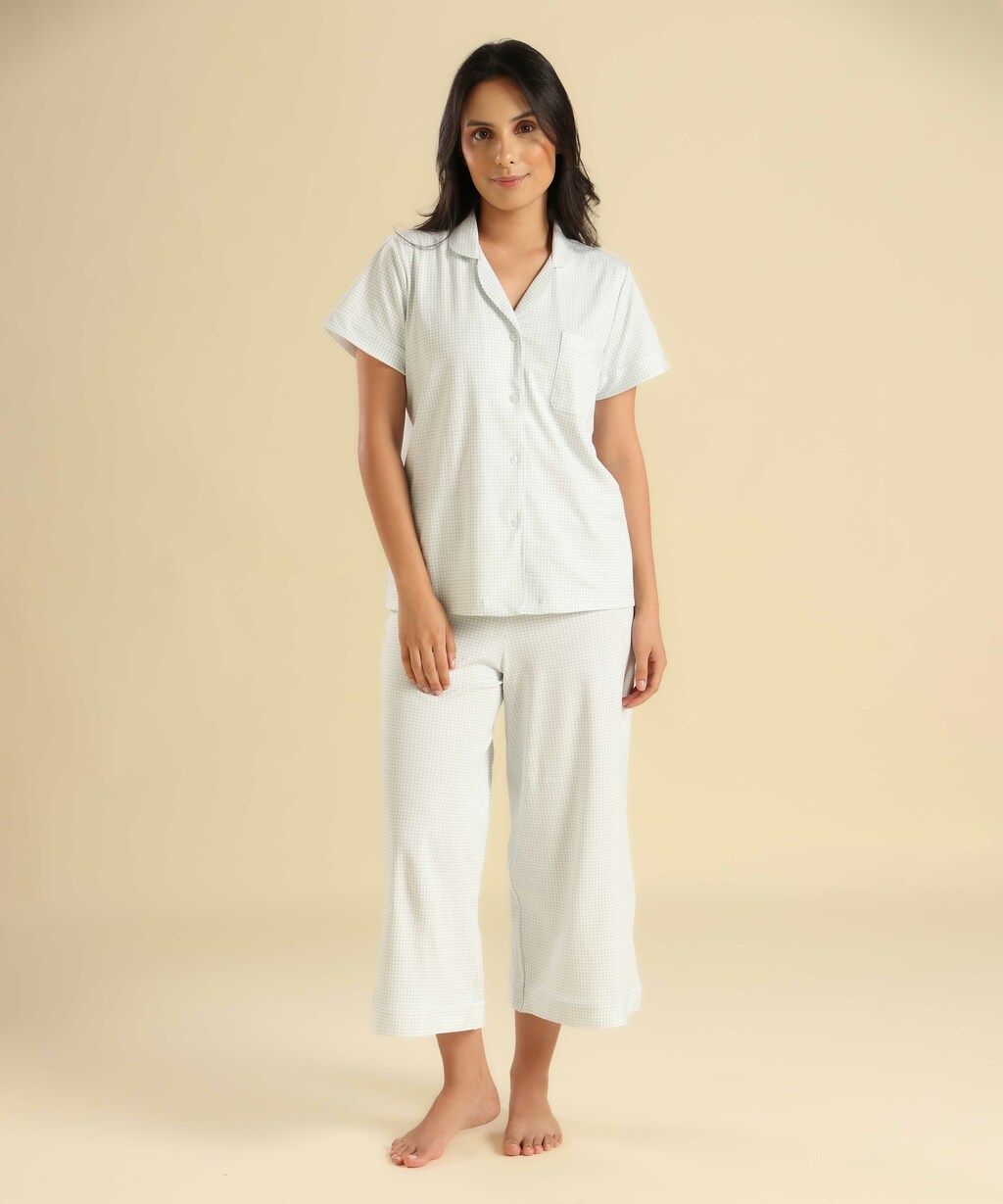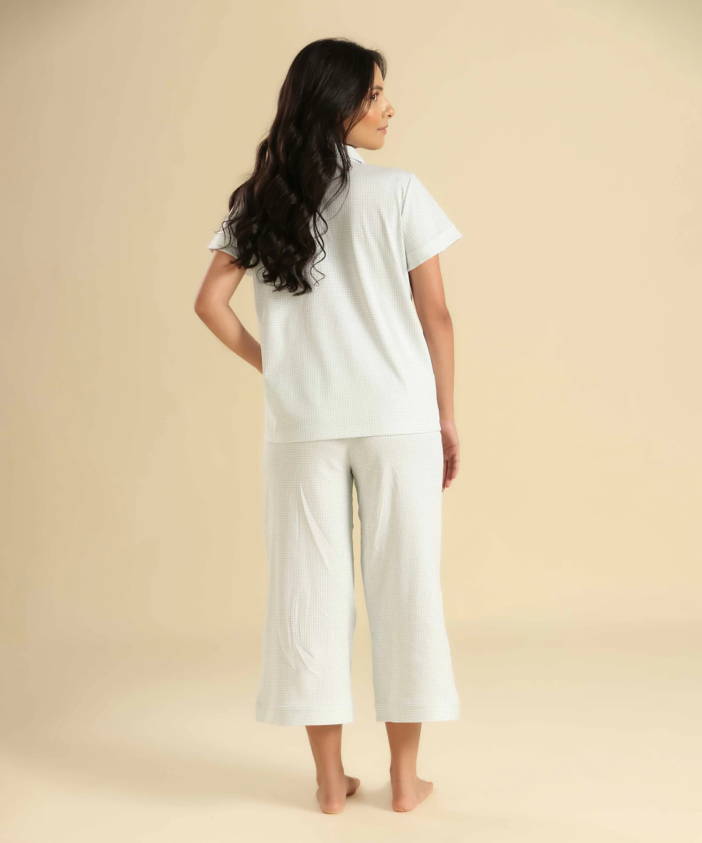 A estampa Pied de Poule é reinterpretada em uma proposta delicada e contemporânea, com abotoamento frontal ideal para a maternidade e amamentação. A calça pantacourt de cintura alta, com vivo na barra, completa o visual com elegância e praticidade.