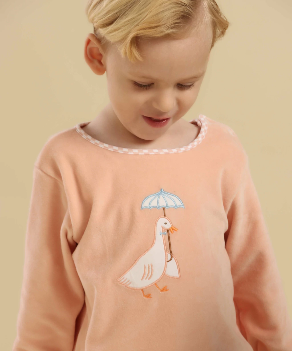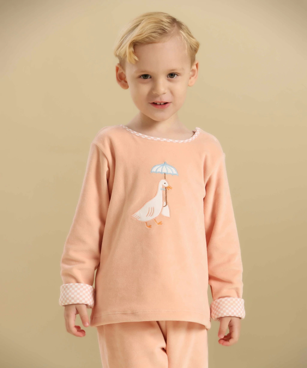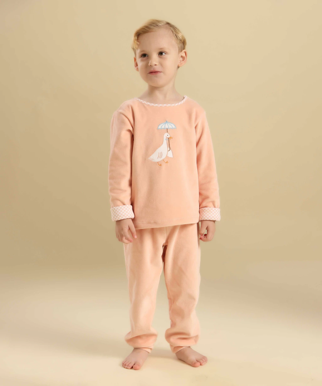 O Pijama Infantil Mr Cookie Plush Ganso Laranja foi criado para aquecer e encantar. Feito em algodão Pima combinado ao toque macio do plush, ele oferece aquecimento suave e respirabilidade, garantindo noites aconchegantes mesmo nos dias mais frios.