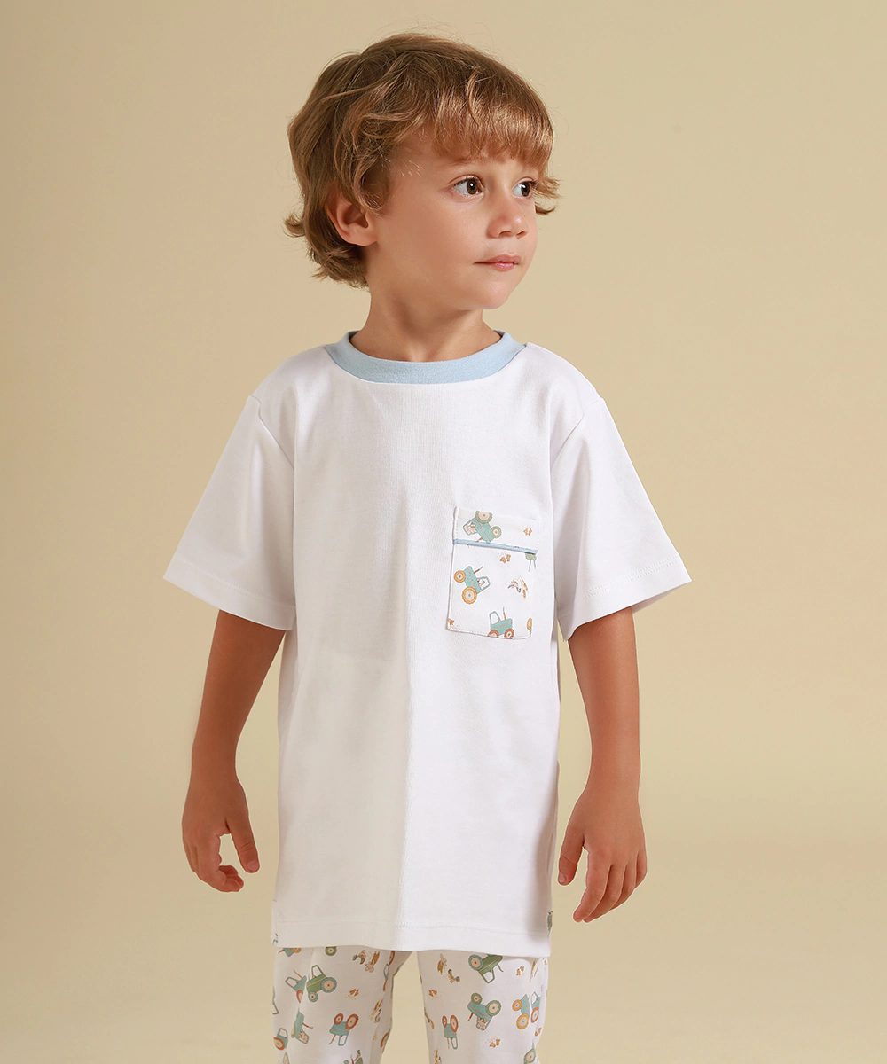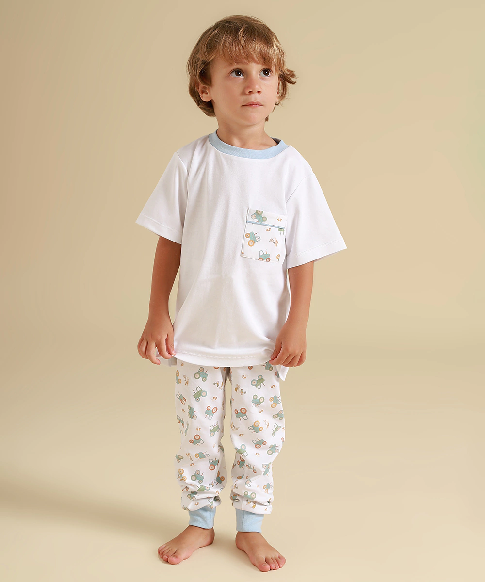O Pijama Mr Tractor é confeccionado em algodão Pima peruano 100 %, um tecido naturalmente macio, hipoalergênico e respirável. Com estampa divertida de trator e tom mulberry aconchegante, ele é ideal para noites frescas com liberdade de movimento.