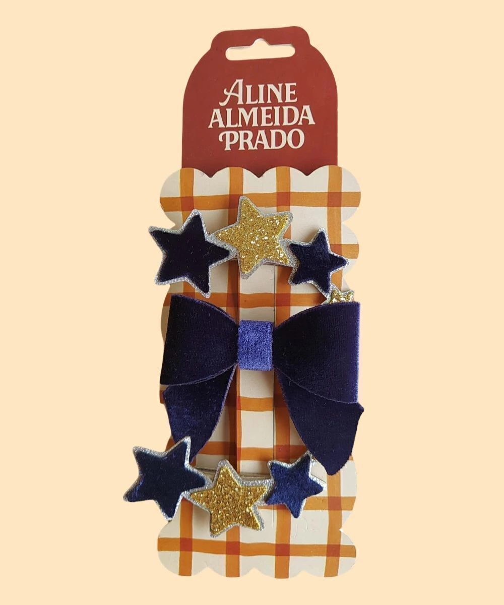 O kit é composto por 1 presilha de laço azul marinho clássico e 2 presilhas com trio de estrelas em glitter delicado, perfeito para dar aquele toque encantador nos penteados das pequenas. Acompanha elástico de cabelo para uma fixação confortável, ideal para diferentes tipos e volumes de cabelo infantil.